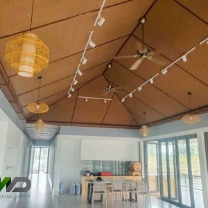 Trần nhà bằng cót tre nhựa mang lại cảm giác ấm cúng, tạo điểm nhấn độc đáo cho không gian. Đây là lựa chọn lý tưởng cho các không gian mang phong cách Đông Dương, nhà vườn hoặc các công trình kiến trúc mang nét truyền thống.
